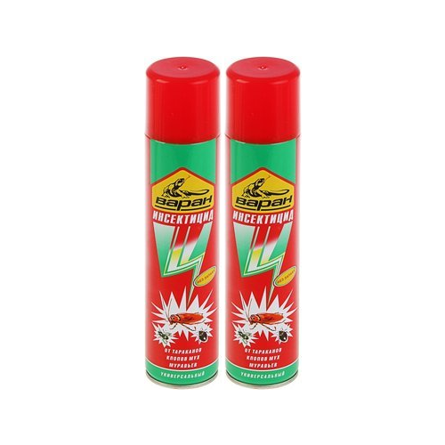 Варан Форте универсальный - средство инсектицидное для уничтожения нелетающих (муравьи, клопы, тараканы, блохи, кожееды) и летающих (мухи, комары, москиты, бабочки моли) насекомых в помещениях. Для уничтожения нелетающих насекомых: с расстояния 15-20 см направить струю аэрозоля на поверхности - места скопления, возможного обитания или пути передвижения насекомых. Для уничтожения муравьев - пути их передвижения (дорожки) и гнезда; тараканов и клопов - места их скопления и возможного обитания (плинтусы, щели в стенах и мебели, места отхождения обоев, обратную сторону картин, ковров); блох - щели в полу и за плинтусами, пороги, стены на высоту до 1 м, подстилки для животных которые перед использованием должны быть выстираны; кожеедов - плинтусы под радиаторами отопления, кроватями, шкафами, подоконники, стыки шкафов, обратную сторону шкафов и полок. После обработки помещение проветрить сквозным потоком воздуха в течение 30 мин.Комплект 2 шт