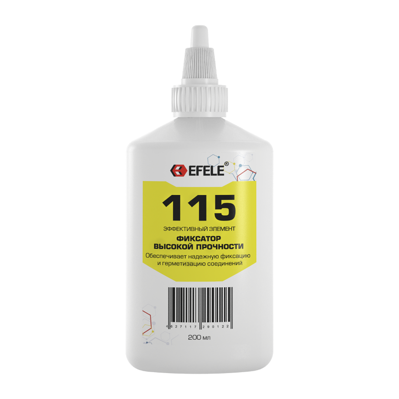 Высокопрочный анаэробный клей EFELE 115 служит для фиксации соединений (размер до М56) деталей, которые не подлежат регулярной разборке. Состав имеет высокую степень адгезии с поверхностями изделий, и при застывании образует высокопрочный материал. Для его разрушения необходимо приложить усилия с использованием спецоборудования или воздействовать термически.