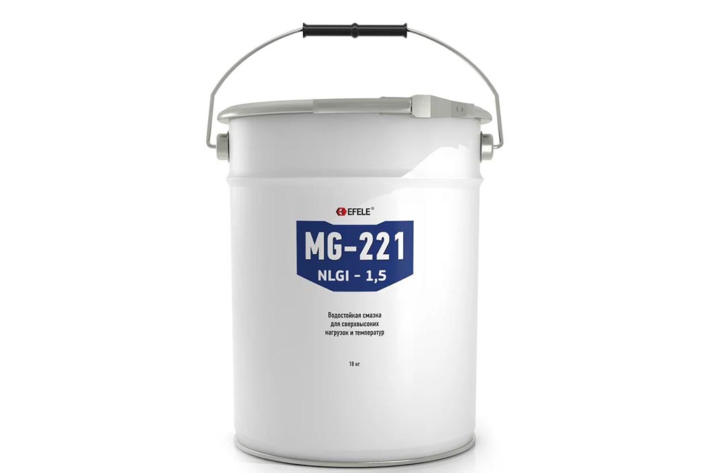 EFELE MG-221 – минеральная смазка для высоких нагрузок с комплексным загустителем на основе сульфоната кальция. Применяется для высоконагруженных узлов трения, работающих при температурах от -30 до +150°С.