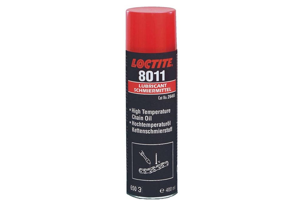 Смазка изготовлена на минеральной основе, имеет в составе литиевое мыло и антизадирные присадки. Loctite 8011 наносится в виде спрея и отлично подходит для цепей, открытых шестерен, червячных передач и тросов. Состав справляется с защитой от воды, проявляет стойкость при воздействии высокого давления и центробежных сил, имеет диапазон рабочих температур -30…+170°С.