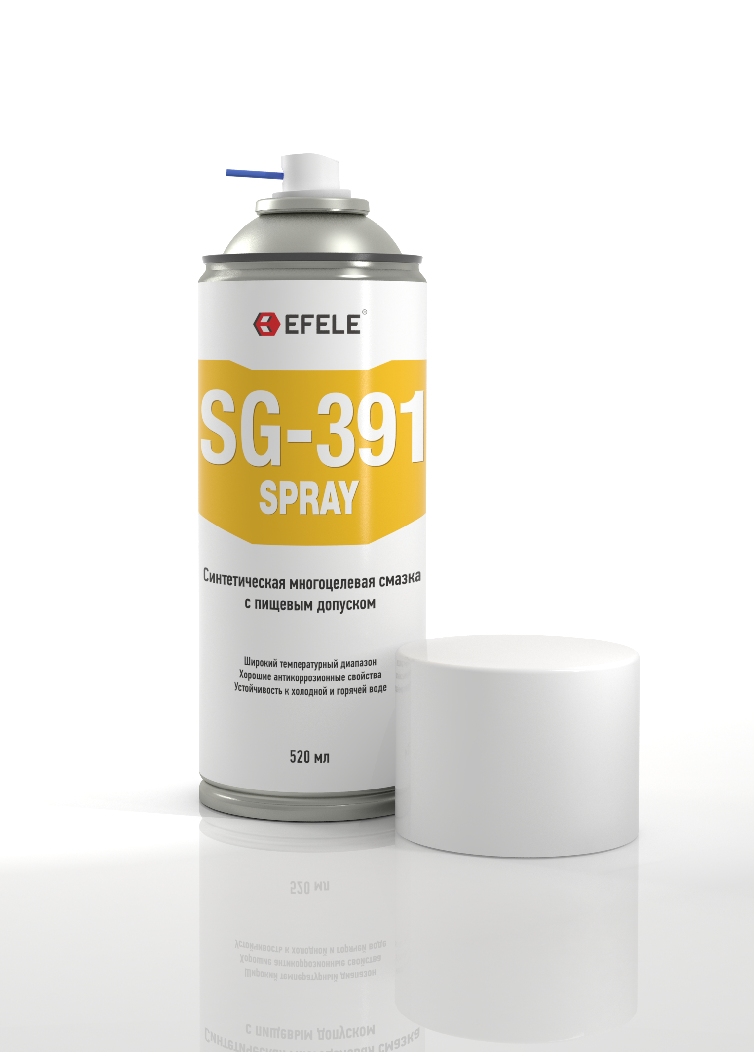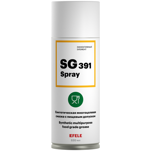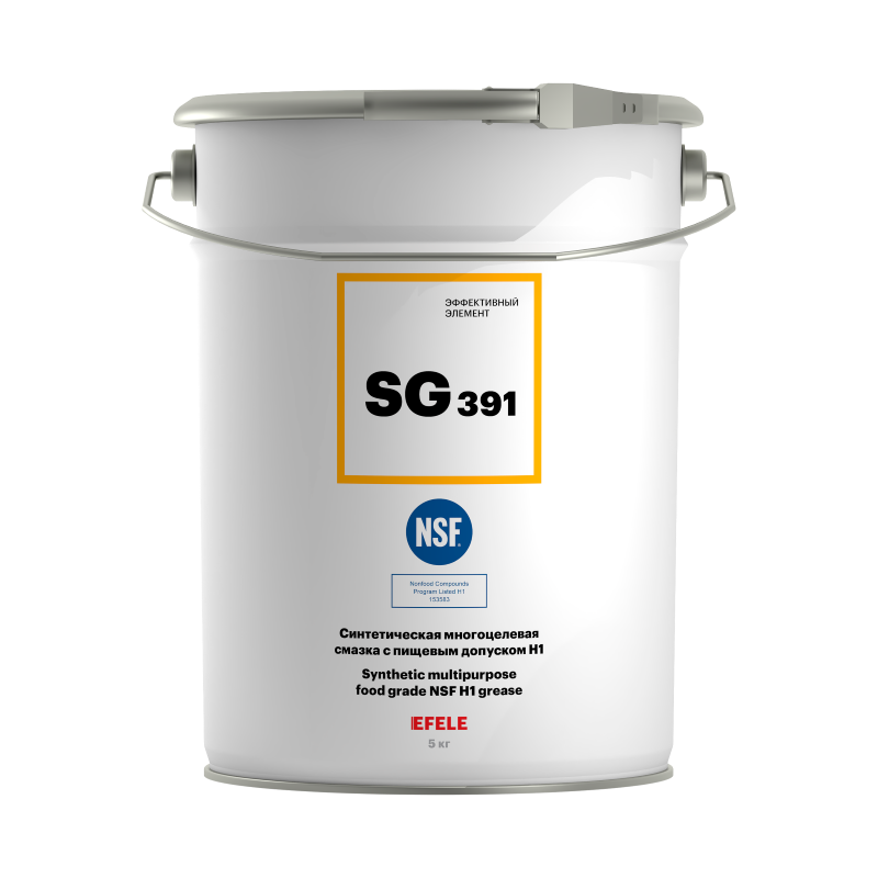 EFELE SG-391 (NSF H1) – синтетический смазочный продукт на базе полиальфаолефина и комплексного алюминиевого мыла. Характеризуется сверхстабильностью при низких температурах до -40 °С и высоких − до +160 °С. Устойчива к смыванию холодной и горячей водой. Может применяться в криогенном оборудовании.