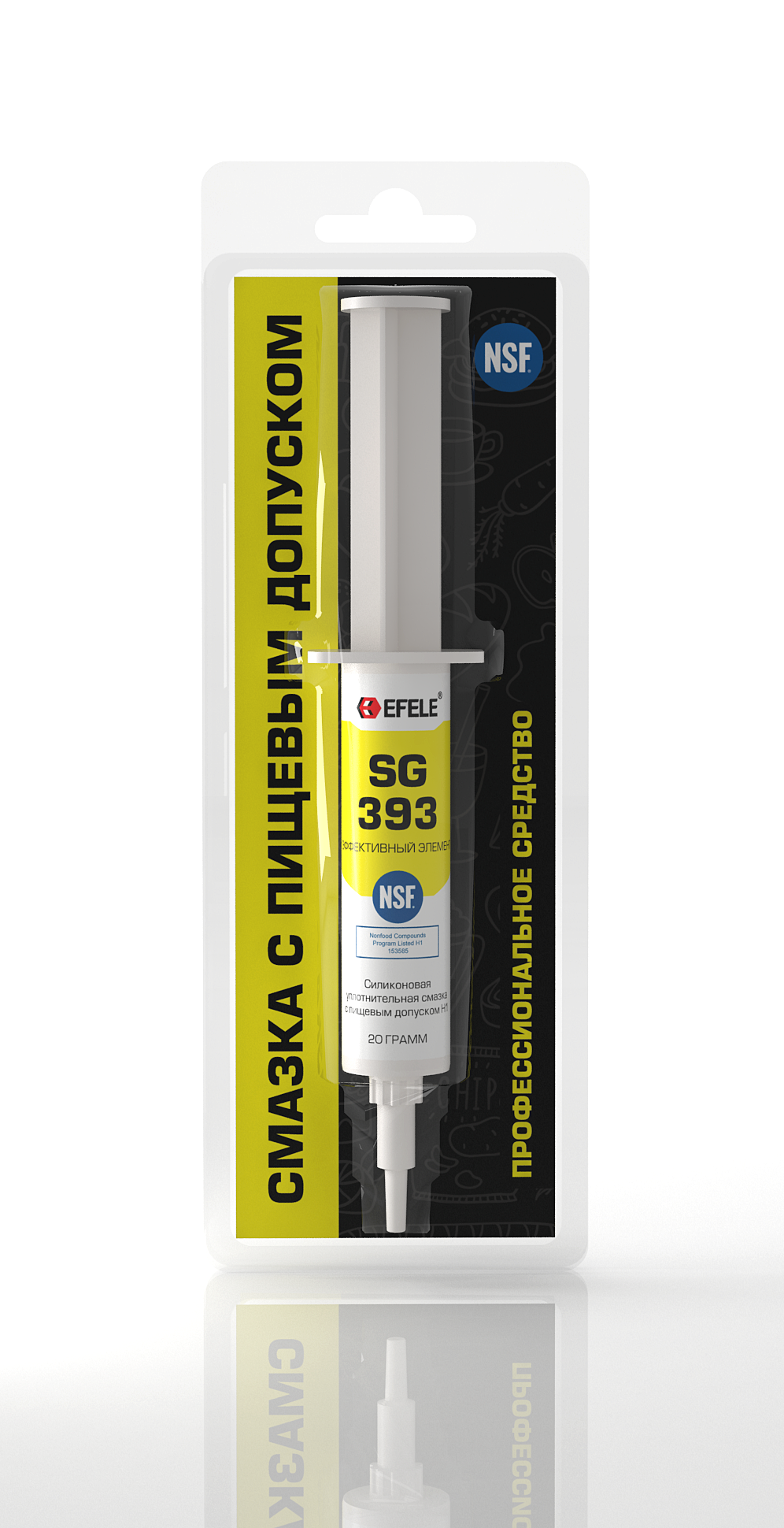 EFELE SG-393 (NSF H1) – силиконовая пластичная смазка, загущенная политетрафторэтиленом. Применяется в качестве уплотнительного состава при монтаже водопроводов и питьевого оборудования. Совместима с металлом, резиной и пластиком. Работает при температурах -40 °С …+160 °С. Характеризуется устойчивостью к смыванию водой.