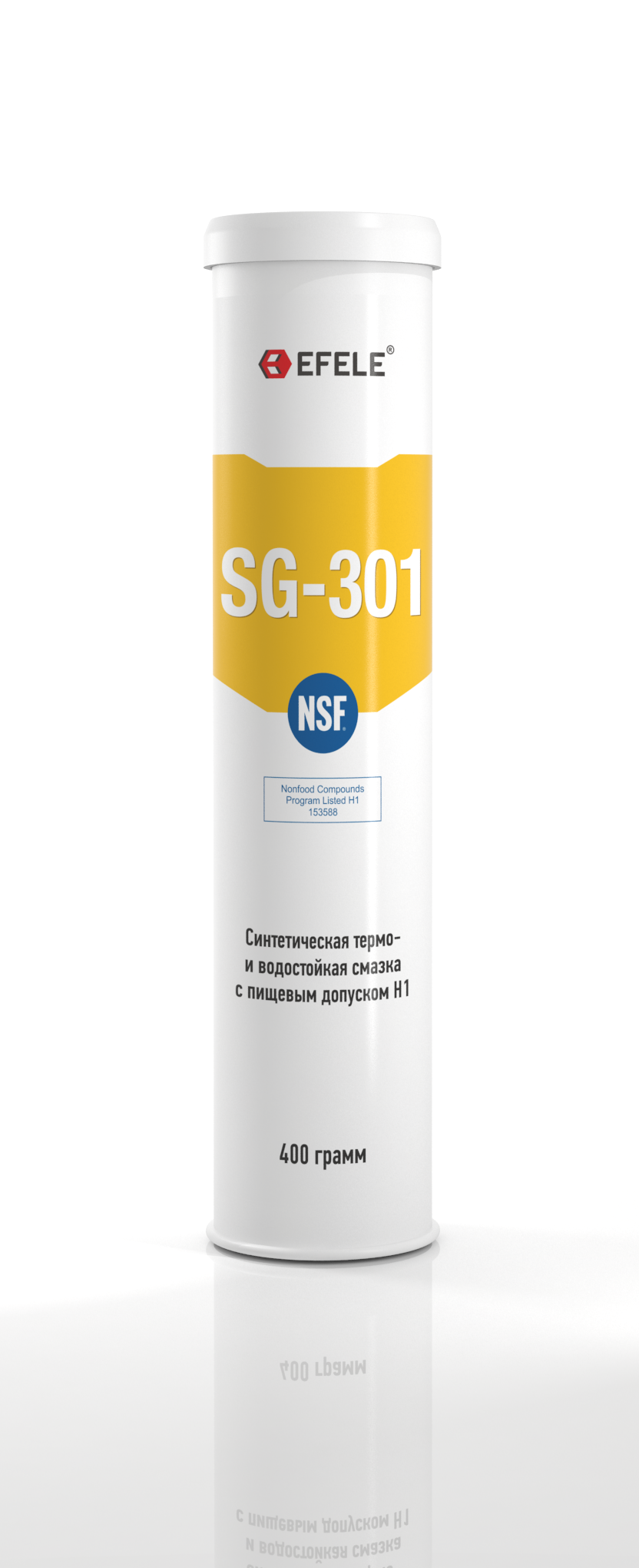 EFELE SG-301 (NSF H1) – синтетическая термо-  и морозостойкая многоцелевая смазка на основе полиальфаолефина и комплекса сульфоната кальция. Работает при температурах -40 °С …+160 °С. Характеризуется высокой несущей способностью и устойчивостью к смыванию водой.