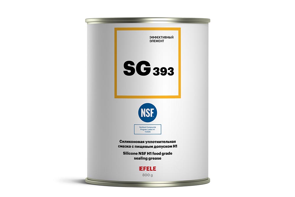 Российская компания «Эффективный элемент» представляет пластичную смазку, изготовленную на основе силиконового масла с политетрафторэтиленом. Диапазон рабочих температур состава равен -40...+160 °С. NSF H1 EFELE SG-393 может использоваться в пищевом производстве, подходит для применения в системах газо- и водоснабжения. Состав совместим с большинством пластмасс и эластомеров, значительно смягчает монтаж и демонтаж оборудования, устойчив к смыванию дезинфицирующими и моющими средствами.