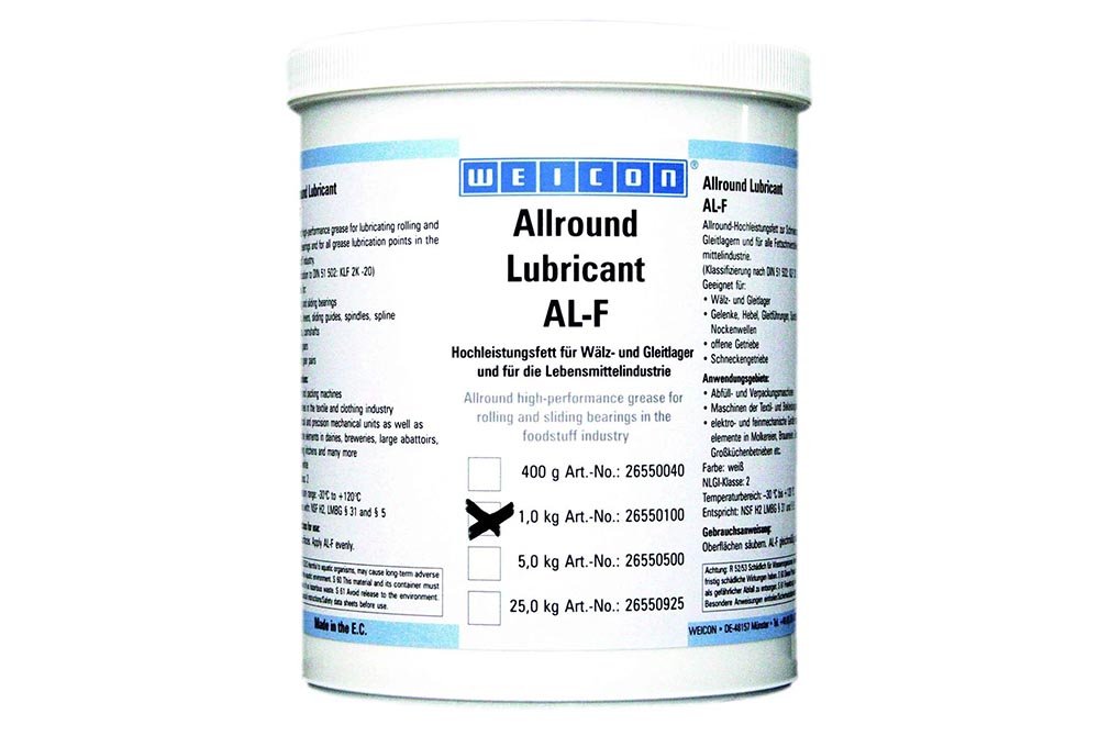 Смазка немецкого производства WEICON Allround Lubricant AL-F изготовлена на основе минерального масла, загущена литиевым мылом. Отличительная черта состава — наличие допуска, позволяющего ее применение в пищевом производстве.