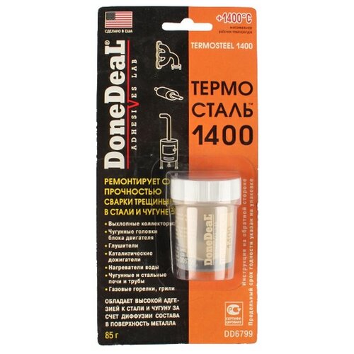 Холодная сварка для выхлопной системы DONE DEAL термосталь 1400 С - высокотемпературный герметик, позволяющий отремонтировать треснувшие или прогоревшие стальные или чугунные детали, работающие при температуре до 1400 °С в условиях вибрации и напряжений. Термосталь 1400 ремонтирует с прочностью сварки трещины в стали и чугуне.Преимущества:обладает высокой адгезией к стали и чугуну за счет диффузии состава в поверхность металла;содержит стальной наполнитель, придающий отремонтированному соединению дополнительную прочность;выдерживает вибрацию и ударные нагрузки;максимальная рабочая температура +1400 °С.