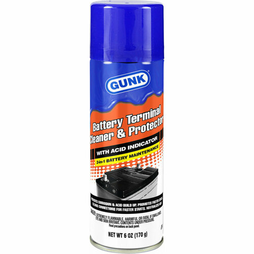 Очиститель и защита клемм АКБ GUNK 2в1, пенный, аэрозоль, 170 г BTCAP6 обеспечивает очистку и защиту клемм, болтов и кронштейнов аккумулятора. Изменяет цвет на светло-красный при наличие кислоты. Защищает от электрохимической коррозии. Продлевает срок службы АКБ. Способствует быстрому запуску, обеспечивая хороший контакт на клеммах. Применение: очистка: обильно распылить на всю поверхность аккумулятора. Спустя несколько минут промыть и протереть поверхность. НЕ использовать проволочную щетку во избежание появления искр. Проверка наличия кислоты: обильно распылите на поверхность. При наличии кислоты, пена изменит цвет на светло-красный. Выдержать несколько минут и протереть поверхность. Защита: нанести на клемы АКБ. Состав: вода >30%, бутоксиэтанол, пропан, бутан, содиум бикарбонат <5%. Хранение: Не допускать нагревания свыше 60°С.