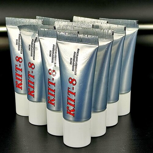 Теплопроводная паста.Кремнийорганическая КПТ-8 служит для увеличения теплопередачи между соприкасающимися поверхностями (для процессоров, для транзисторов, для электронных приборов, где требуется теплоотвод и есть опасность перегрева при нормальной работе).Цвет: белая паста без включенийТеплопроводность Вт./(Мк): 0.8-1Удельное сопротивление Ом/см: 1011Электрическая прочность кВт/мм: 2-5Тангенс диэлектрических потерь при 10 МГц: 0.005Рабочие температуры от -60 до +180ГОСТ 19783-74Инструкция: нанести нужное количество пасты на поверхность, примкнуть плотно радиатор.Рекомендация: старайтесь применять пасту более тонким слоем - это обеспечит лучшую скорость отвода тепла. Излишки пасты удалить.