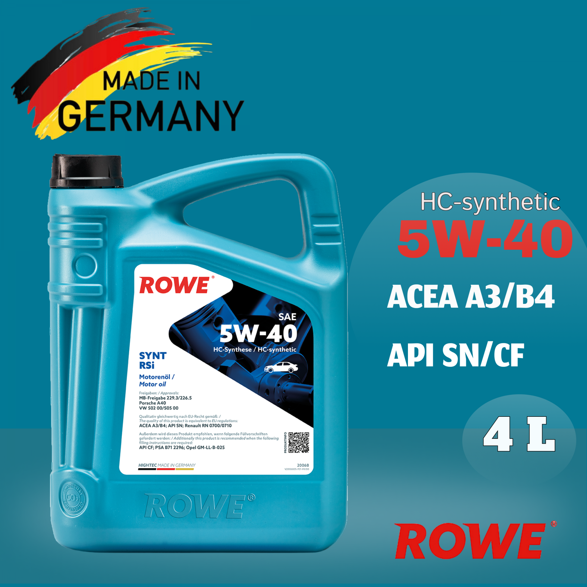 4 литра моторного масла ROWE HIGHTEC Synt RSi SAE 5W-40. Сбалансированное моторное масло с вязкостью SAE 5W-40. Допуска: MB-Freigabe 229.3/226.5 Porsche A40 VW 502 00 / 505 00 ACEA A3/B4 API SN Renault RN 0700 / 0710 API CF PSA B71 2296 Opel GM-LL-B-025 Первоклассное усовершенствованное моторное масло для многофункционального использования в дизельных и бензиновых двигателях различных производителей. Моторное масло Rowe Synt RSi 20068-0050-99 5w40 с хорошими антифрикционными свойствами на основе HC-Synthese. Бесперебойная работа гидравлических толкателей (гидравлическое регулирование зазора в клапанах). Rowe hightec synt rsi 5w-40 особенно хорошо подходит для транспортных средств с бензиновыми и дизельными двигателями, а также с турбонаддувом. Используется для транспортных средств без продленного интервала техобслуживания. Надежно предотвращает «слипание», лакообразование и коксование цилиндров, поршней, клапанов и турбонагнетателей. Безопасный холодный запуск и быстрое промасливание двигателя. Стабильная смазочная пленка даже при горячем масле и экстремальных нагрузках. Взаимодействие отборных базовых масел и современных присадок обеспечивает очень высокий уровень его производительности. Надежная эксплуатация в течение всего года благодаря отличным вязкостно-температурным характеристикам и высокой устойчивости к сдвигу. Возможность смешивания и отличная совместимость с традиционными, а также синтетическими моторными маслами.