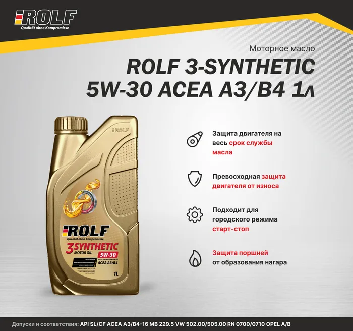 Описание: Моторное масло ROLF 3-SYNTHETIC 5W30 — это высококачественное синтетическое моторное масло, предназначенное для использования в современных бензиновых и дизельных двигателях легковых автомобилей и лёгкого коммерческого транспорта.