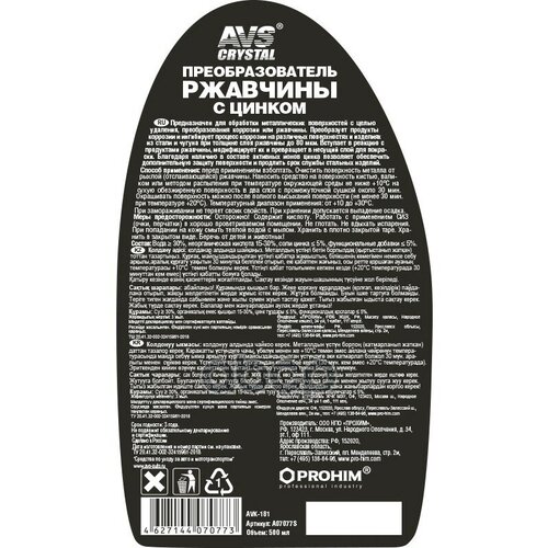 Товарное предложение: Преобразователь ржавчины с цинком (триггер) 500 мл AVS AVK-181