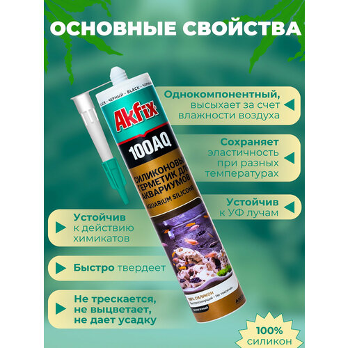 100AQ, однокомпонентный силиконовый герметик, преднозначен для изготовления и ремонта аквариумов. Под воздействием влажности воздуха превращается в нетоксичный уплотнитель, обеспечивающий превосходное склеивание стекла и многих других непористых материалов.Основные свойства: 100%-ый силиконовый состав Прочно и физически сильно склеивает Быстро твердеет Безопасен для рыб Однокомпонентный, высыхает за счет влажности воздуха Сохраняет эластичность при низких и высоких температурах Не трескается, не выцветает и не дает усадку Устойчив к действию многих химикатов Устойчив к УФ лучам