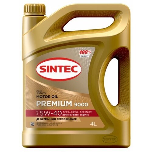 Полностью синтетическое моторное масло «SINTEC PREMIUM 9000 5W-40 A3/B4» производится на основе смеси высококачественных синтетических базовых масел и высокоэффективного многофункционального пакета присадок. Синтетическая базовая основа из масел гидрокрекинга, имеющих низкую испаряемость, высокие индекс вязкости и термоокислительную стабильность, дополнительно усилена полиальфаолефинами, обеспечивающими отличную текучесть при отрицательных температурах. Алкилированные нафталины формируют постоянный смазочный слой на сопряженных поверхностях пар трения, обеспечивая защиту двигателя от износа как во время холодного пуска, так и в режимах работы старт-стоп в сложных условиях городского траффика. Высокая термоокислительная стабильность и запас моющих свойств противодействуют образованию отложений в двигателе. Предназначено для применения в высокофорсированных бензиновых и дизельных двигателях легковых автомобилей и лёгких грузовиков, где рекомендованы смазочные материалы эксплуатационного класса ACEA А3/B4 или API SN (или более ранних спецификаций) и соответствующего класса вязкости SAE 5W-40. Рекомендовано для применения в автомобилях марок Mercedes-Benz, где требуется масло эксплуатационного уровня MB 229.5. Рекомендовано для применения в автомобилях Volkswagen Group (VW, Skoda, Audi, Seat), где требуются масла по спецификации VW 502.00/505.00