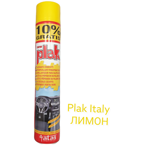 Полироль салона PLAK, объёмом 750 мл с ароматом лимона, в форме аэрозоля предназначен для придания приборной панели и другим деталям интерьера автомобиля освежённого внешнего вида.