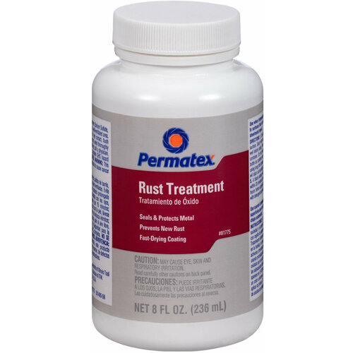 Кузов автомобиля ежедневно подвергается воздействию факторов окружающей среды. Щебень, дорожные реагенты, влажность - все это оказывает негативное воздействие на составляющие части автомобиля, что нередко приводит к появлению ржавчины. Устранить и предотвратить образование коррозионных поражений на металлических поверхностях поможет эффективное средство для удаления очагов коррозии – преобразователь ржавчины в грунт PERMATEX RUST TREATMENT.Удалитель ржавчины PERMATEX является быстровысыхающим латексным покрытием молочно-белого цвета, предназначенным для нанесения на ржавчину для остановки коррозии метала, защиты поверхности посредством образованием грунта для последующего нанесения финишного покрытия - краски.Высокоактивный состав преобразователя обеспечивает эффективное угнетение коррозийных процессов и устранение ржавчины. Под действием окислов железа образует на металле прочное черное покрытие - грунт. Что продлит срок службы стальных изделий и защитит поверхность от последующих атмосферно-климатических воздействий. А так же может служить основой для покраски.Преимущества:Простота и легкость применения;Высокоэффективный состав;В течение всего лишь нескольких минут модифицирует ржавчину и образует прочное черное полимерное покрытие;Обеспечивает одноступенчатую обработку против ржавчины;Преобразует даже застарелую ржавчину и предотвращает появление новой;Может использоваться на влажном заржавевшем металле;Одновременно преобразует ржавчину и грунтует поверхность.Способ применения:✅Удалить с поверхности грязь и смазочные материалы. Удалить с поверхности с помощью проволочной щетки рыхлую ржавчину, окалину и краску.✅Смыть водой с поверхности остатки пыли и частиц. ❌Оставшаяся легкая ржавчина должна крепко держаться на поверхности и не сниматься вытиранием. Предварительно подготовленная поверхность легко поддается обработке Преобразователем ржавчины.✅Тщательно перемешать перед использованием.✅Налить некоторое количество преобразователя ржавчины в чистую емкость для более легкого нанесения.✅Обильно нанести на поверхность кистью, валиком или губкой. Для поверхностей, имеющих большую площадь, предпочтительнее наносить преобразователь ржавчины с помощью спрея. Метод безвоздушного распыления экономит время и обеспечивает более высокую эффективность применения благодаря лучшей проникающей способности. Также может быть использован метод традиционного воздушного распыления, однако для лучшего распыления может потребоваться разбавление Преобразователя ржавчины до 10% водой.✅В течение 20 минут в зависимости от температуры и относительной влажности воздуха поверхность меняет цвет от пурпурного до черного. Неравномерность цвета сигнализирует о необходимости нанесения дополнительного слоя. Для максимальной защиты необходимо два слоя Преобразователя ржавчины для достижения рекомендованной толщины сухой пленки 0,1мм. Нанести второй слой в течение 15-30 минут после нанесения первого. Выдержать минимум 24 часа для высыхания перед грунтованием или окрашиванием.❕Большинству красок не требуется дополнительного грунтования. Тем не менее, краски на водной основе и металлосодержащие краски требуют дополнительный слой грунта на основе растворителя.
