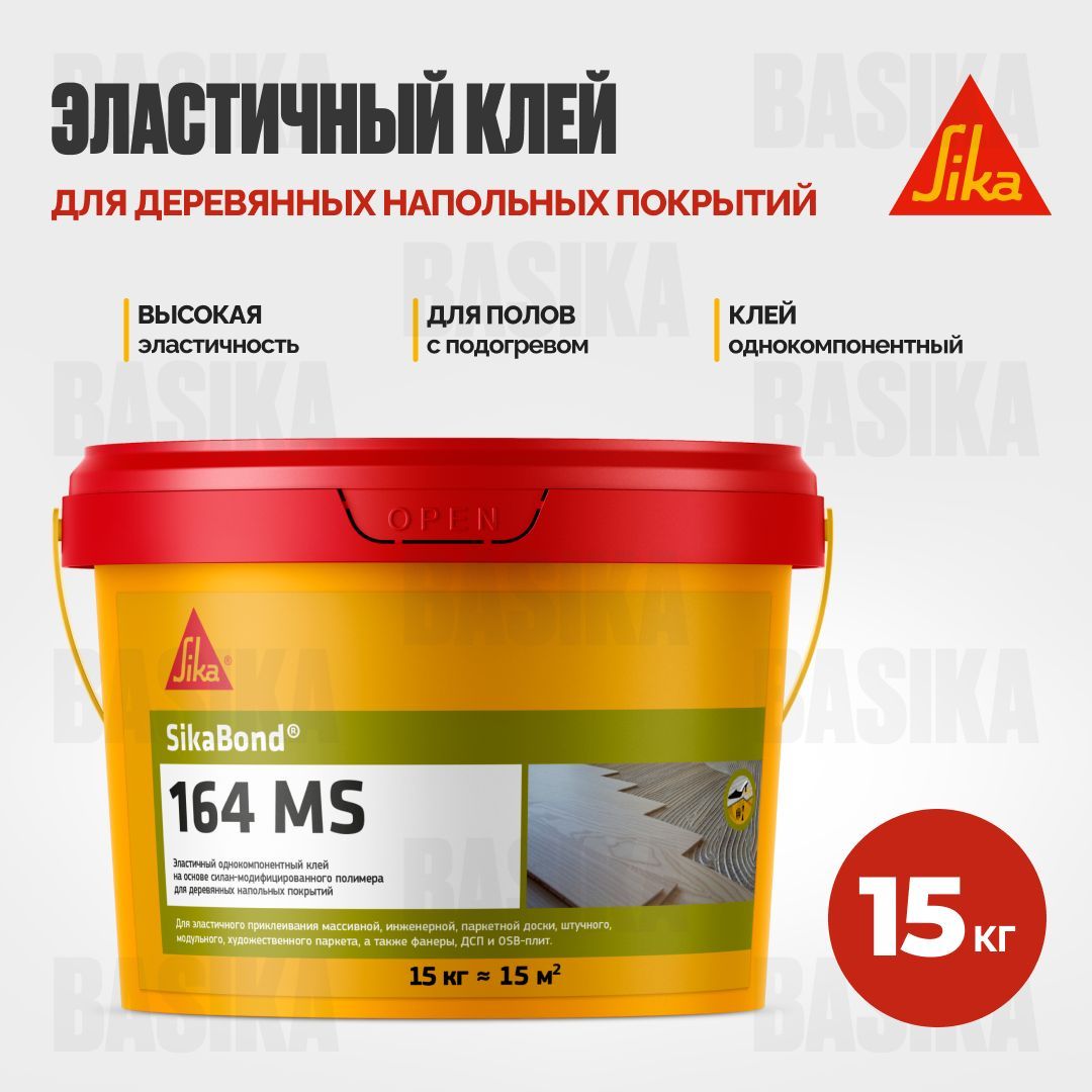 SikaBond®-164 MS - однокомпонентный, не содержащий растворителей и воды клей для деревянных полов на основе силан-модифицированного полимера (SMP). НАЗНАЧЕНИЕ Типы деревянных полов для приклеивания по всей поверхности: ? Инженерная доска ? Мозаичный паркет ? Лампаркет (? 55 ? 220 мм, толщина ? 10 мм), паркет без шип-паза ? Массивная доска (отношение толщины к шири не менее 1:10) Типы оснований: ? Бетонные стяжки ? Цементные стяжки ? Магнезиалььные основания ? Кальциево-сульфатные основания ? Паркет ? Фанера? Древесно-стружечные плиты (ДСП) (V100) ? Ориентированно-стружечные плиты (ОСП) ХАРАКТЕРИСТИКИ / ПРЕИМУЩЕСТВА ? Лёгкость нанесения ? Стабильный клеевой гребень ? Лёгкость очистки ? Пешая нагрузка через 24 часа ? Подходит для полов с подогревом