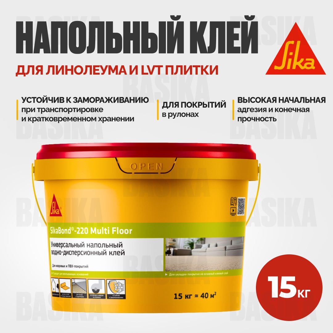 SikaBond®-220 Multi Floor однокомпонентный водно-дисперсионный клей для ковровых и ПВХ напольных покрытий SikaBond®-220 Multi Floor предназначен для приклеивания напольных покрытий на впитывающие основания внутри помещений: - ПВХ покрытия в рулонах - виниловые - ковровые покрытия на синтетических и натуральных подложках - для бытового и полукоммерческого применения ХАРАКТЕРИСТИКИ / ПРЕИМУЩЕСТВА ? Приклеивание на впитывающие влагу основания ? Для покрытий в рулонах ? Высокая начальная адгезия и конечная прочность ? Для укладки покрытий на влажный клеевой слой ? Для теплых полов и под мебель на роликах ? Устойчив к замораживанию