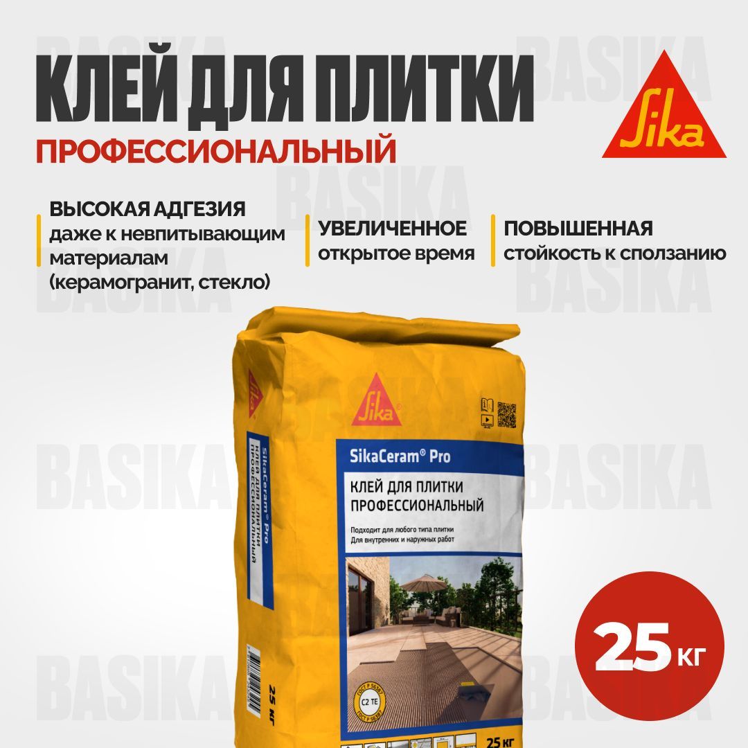 SikaCeram® Pro – усиленный цементный плиточный клей с повышенной стойкостью к сползанию и увеличенным открытым временем, предназначенный для внутренних и наружных работ по укладке керамической плитки, керамогранита, натурального и искусственного камня. Соответствует классу C2 TE по ГОСТ Р 56387. SikaCeram® Pro предназначен для внутренних и наружных работ по облицовке стен и полов плиткой размером до 100?100 см (допускается монтаж плитки размером 120?60 cм) и подходит для: ?укладки плитки в помещениях с высокой пешеходной нагрузкой; ? облицовки фасадов, входных групп, террас, цоколей; ? укладки мозаики и малоформатной плитки в крытых бассейнах, аквапарках и фонтанах;? облицовки поверхностей с существующими плиточными облицовками; ? укладки плитки на полы с подогревом. Рекомендованные типы плитки: ? все типы керамической плитки (керамическая плитка одинарного и двойного обжига, клинкерная, фарфоровая, терракотовая плитка и т. д.);? керамогранит; натуральный и искусственный камень (нечувствительный к влаге). Рекомендованные типы оснований: ? бетон, ячеистый бетон, кирпич; ? цементные и цементно-известковые штукатурки; ? цементные стяжки; основания на гипсовом или смешанном вяжущем (обязательно грунтование или нанесение совместимой полимерной гидроизоляции); ? гипсовые листы и плиты (обязательно грунтование или нанесение совместимой полимерной гидроизоляции); ? существующие плиточные облицовки; цементные или совместимые полимерные гидроизоляционные составы (например Sikalastic®-152 RU, Sikalastic®-022 W и т. п.); ? обладающие достаточной жёсткостью плиты ДСП, ДВП, ОСП. ? высокая адгезия даже к невпитывающим материалам (керамогранит, стекло); ? с увеличенное открытое время; ? повышенная стойкость к сползанию; ? высокая водо- и морозостойкость.