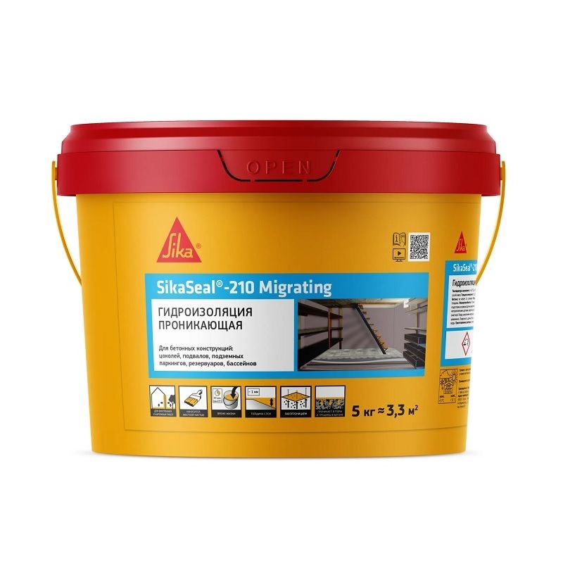 SikaSeal®-210 Migrating - это однокомпонентный гидроизоляционный раствор на цементной основе, содержащий проникающие компоненты, кристаллизирующиеся в порах бетона и повышающие его водонепроницаемость. Характеристики/преимущества SikaSeal®-210 MigratingОднокомпонентная сухая смесь, затворяется водой.Капиллярно-активные химические добавки глубоко проникают в поры тела бетона и формируют совместно с существующими компонентами цементного камня новые нерастворимые кристаллы, которые заполняют поры и капилляры, защищая их от проникновения воды и других жидкостей, повышая при этом водонепроницаемость бетона.Высокая паропроницаемость.Повышение морозостойкости бетона.Повышение марки бетона по водонепроницаемости после применения не менее 3 ступеней (например, марка бетона W2 повышается до W8).Срок хранения 12 месяцев со дня изготовления.КомплектацияПластиковое ведро 5 кг. Не кантовать при перевозке!