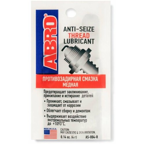 Описание:смазка с добавлением измельченных медных частиц, предназначенная для использования при высоких температурах и тяжелом режиме работы.Сфера применения: • резьбовые соединения свечей зажигания;• болты двигателя, турбокомпрессоров, впускных коллекторов, болты головки блока цилиндров;• анкерные пальцы в тормозных системах;• U-образные и пружинные болты;• петли, зубчатые передачи, цепи и зубчатые барабаны;• детали котлов и печей, реактивные двигатели, промышленные турбины. Свойства:• предотвращает заклинивание, прикипание и истирание деталей;• эффективно смазывает и упрощает демонтаж деталей, подверженных воздействию высокого контактного давления и высоких температур;• препятствует коррозии и заклиниванию деталей в результате изменения погодных условий и применения химикатов;• не растекается под воздействием экстремальных температур (до +1093°С);• морозостойкая;• снижает износ при использовании в условиях высокого давления;• не содержит свинец и никель.