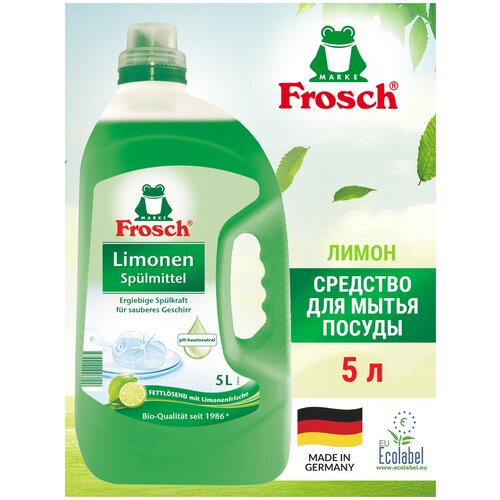 Средство для мытья посуды FROSCH «Зелёный лимон» растворяет жир и способствует самовысыханию посуды. Активные вещества на натуральной основе с экстрактом кожуры лимона расщепляют остатки пищи, быстро очищая посуду и оставляя приятный запах лимона.