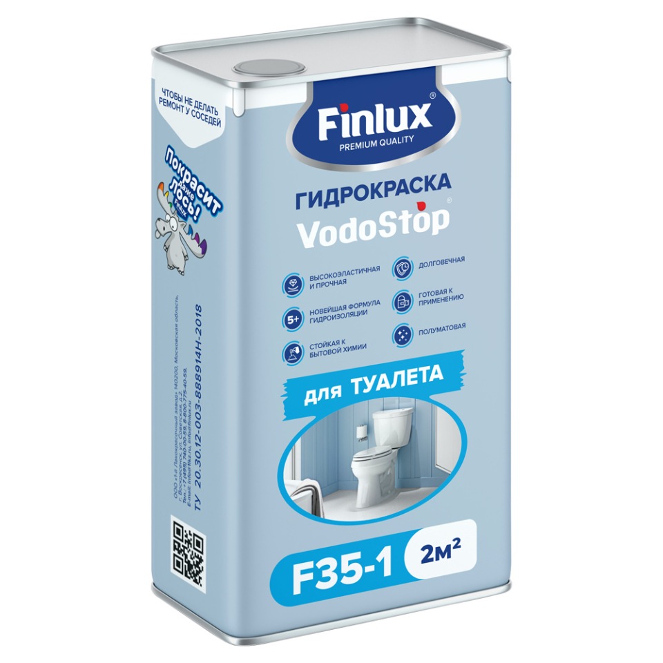 Технологичная гидроизоляционная краска для туалетных комнат Finlux VodoStop F35-01 / Финлюкс ВодоСтоп Ф35-01.Высокоэластичная гидроизоляционная краска 5 поколения для туалетных комнат (санузлов) на основе Японских и Финских полимеров, с эффектом VodoStop, поможет Вам сохранить пол и стены в туалетной комнате от негативного воздействия воды и влаги и создать долговечную гидроизоляцию, чтобы не делать ремонт у соседа. Используется перед укладкой покрытий из керамической плитки, природного камня с использованием плиточных клеев на цементной основе, а также при устройстве обогреваемых полов, в помещении санузла, где имеется наибольший риск перелива воды и протечек в трубопроводах. С помощью всего 1 банки, Вы сможете самостоятельно создать эффективный водонепроницаемый барьер в помещениях площадью до 2 кв/м, навсегда обеспечив полную гидроизоляцию, перед облицовкой, на долгие года, даже в условиях повышенной влажности и закрыть вопрос с образованием плесени и грибка.