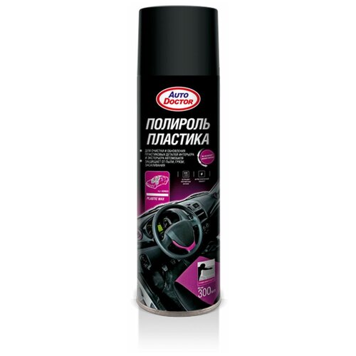 Полироль пластика 300мл аэрозоль.Полироль пластика AutoDoctor - профессиональный состав предназначен для очистки и обновления пластиковых деталей интерьера и экстерьера автомобиля, обивки из винила, кожи, пластика, дерева и других. Отлично защищает обрабатываемую поверхность от пыли, грязи и засаливания, а также предохраняет от старения и растрескивания. Обладает антистатическим эффектом. Не создает маслянистого глянца. Может использоваться в быту - для обновления кожаной мебели, обуви, сумок и т. д. Обработка составом поверхностей панели приборов понижает температуру за счет интенсивного отражения ультрафиолетовых лучей.Хорошо встряхните баллон перед использованием. Распылите состав с расстояния 20 - 30см на обрабатываемую поверхность и равномерно распределите его по поверхности чистой тряпкой или губкой. Выждите несколько минут, дав составу впитаться. Отполируйте поверхность до появления блеска чистой, мягкой тряпкой.