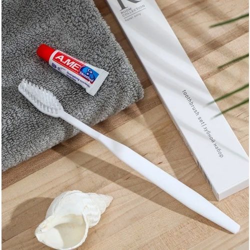 Набор из 200 штук одноразовых зубных щеток. С каждой щеткой в комплекте зубная паста 5 мл. В наборе 200 комплектов, зубная щетка + паста. Количества пасты в одном тюбике хватит на 2-3 дня использования. Набор подойдет для путешествий, поездок на поезде. Одноразовая мини косметика в индивидуальной упаковке будет удобна для использования в ванной комнате Вашего отеля, гостиницы, так же очень удобно брать в поездки, спортзал, после посещения пляжа, бассейн, СПА, баню и массажный кабинет. Одноразовая продукция серии Room повысит комфорт гостей. В коллекции серии Room вы можете купить одноразовый шампунь, одноразовый гель, лосьон для тела одноразовый, одноразовое мини мыло, одноразовый зубной набор, одноразовый бритвенный набор, губка-мочалка для тела, губка для обуви одноразовая, расчёска индивидуальная дорожная, одноразовые шапочки для душа, одноразовый швейный набор.