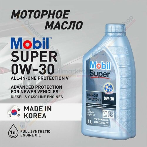 Mobil Super™ All-In-One Protection V 0W-30 — малозольное, высокоэффективное полностью синтетическое моторное масло для европейских автомобилей с дизельными и бензиновыми двигателями, разработанное для продления срока службы масла и поддержания эффективности автомобильных систем снижения выбросов.Это моторное масло разработано специально для обслуживания автомобилей VAG (VW, Audi, Porsche).Mobil Super™ All-In-One Protection V 0W-30 обеспечивает превосходную защиту от износа при высоких и низких температурах и чистоту двигателя.Ключевые особенности и преимущества:• Совместимо с сажевыми фильтрами и каталитическими нейтрализаторами. Состав с низким содержанием золы, фосфора и серы помогает продлить срок службы и поддерживать эффективность систем снижения выбросов как в дизельных, так и в бензиновых двигателях.• Отличные характеристики при низких температурах для надежного запуска в холодную погоду обеспечивают быструю защиту двигателя и электрической системы.• Высокая эффективность защиты от износа, обеспечиваемая высокой прочностью масляной пленки и системой присадок.• Активные чистящие средства, уменьшающие образование отложений и шлама, обеспечивают долгий и чистый срок службы двигателя.• Подходит для длительного обслуживания.Масло Mobil Super™ All-In-One Protection V 0W-30 рекомендуется для современных бензиновых и дизельных двигателей с турбонаддувом и непосредственным впрыском, оснащенных системами очистки выхлопных газов (соответствующих стандартам Евро 6, Евро 5 и Евро 4). Оно имеет допуск VW 504 00 / VW 507 00 для использования в автомобилях VAG начиная с 2000 года выпуска.Масло Mobil Super™ All-In-One Protection V 0W-30 также рекомендуется для японских и корейских автомобилей, в которых указано малозольное моторное масло ACEA C3/SAE 0W-30
