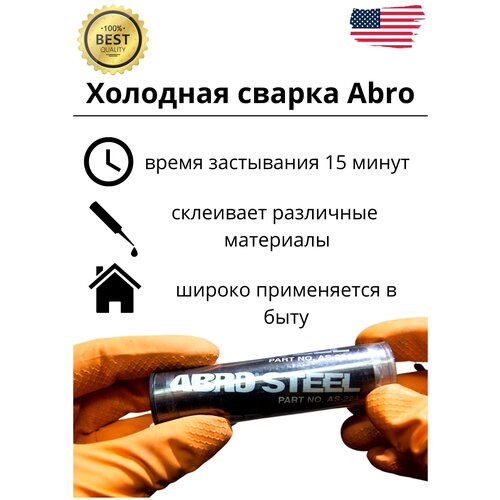 С помощью холодной сварки ABRO вы легко восстановите отломанную или потерянную деталь. Холодная сварка ABRO черная 57 г AS-224-R восстанавливает утраченные фрагменты и поврежденные детали, прочно склеивает металлические, деревянные, пластмассовые, стеклянные и керамические элементы.В автомобилях холодная сварка abro чёрная применима для бензобаков, радиаторов, глушителей, корпусов аккумуляторов, поддонов картера, головок блока цилиндров, корпусных и кузовных деталей. В быту нередко требуется холодная сварка мебели, сантехники, холодная сварка труб горячей и холодной воды, аквариумов, инструментов, стекла и зеркал, садового инвентаря и многого другого.Сварка увеличивает свой объем при затвердевании, т. е. возникает эффект пробки. Таким образом, возможен ремонт при вытекании жидкости из поврежденного агрегата или даже под водой, поэтому холодная сварка универсальная ABRO незаменима при ремонте любой сантехники, починке катеров и яхт.После отвердевания холодная сварка допускает обработку на токарном станке, шлифовку, сверление, нарезку резьбы, а также покраску. С помощью холодной сварки ABRO вы легко восстановите отломанную или потерянную детал