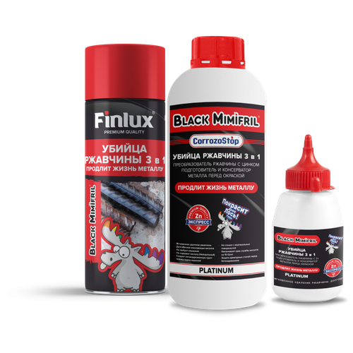 Преобразователь ржавчины Finlux CorroZoStop Black Mimifril — эффективный комплекс для обрабатываемой поверхности. Средство от ржавчины обладает активной формулой " убийцы". Средство против ржавчины Finlux CorroZoStop Black Mimifril наносит тройной удар по ржавчине: • Удаляет ржавчину и плотно сцепленную прокатную окалину, преобразовывая ее в крепко держащуюся на поверхности цинко-хромированную пленку. • Удалитель ржавчины образует прочное полимерное покрытие темного цвета, которое является отличным защитным грунтом перед последующим окрашиванием и увеличивает срок службы финишного лакокрасочного покрытия. • Нейтрализатор ржавчины дезактивирует образование коррозии, формируя защитное покрытие. Уникальный преобразователь ржавчины с цинком - отличная альтернатива механической очистки коррозий. Как только Вы нанесете средство от ржавчины на металле - «Убийцу», растворитель ржавчины практический моментально начнет «выедать» ржавчину и плотно сцепленную прокатную окалину, преобразуя ее в крепко держащуюся пленку черного цвета на поверхности. Finlux - справится даже Лось!