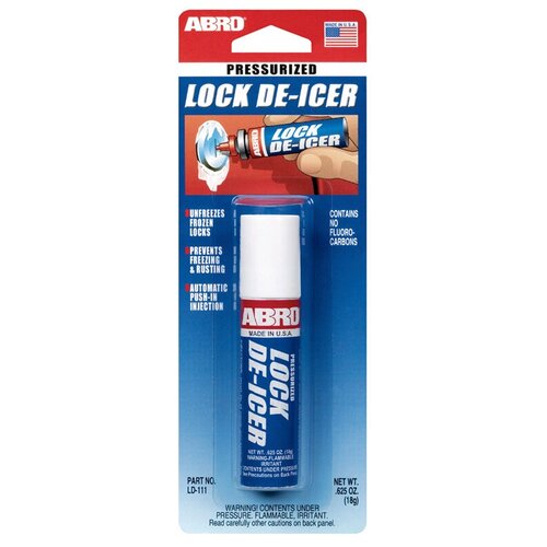 Размораживатель ABRO - специальное жидкое средство в компактном флаконе, предназначенное для обледеневших замков.Сфера применения:размораживает личинку замков в дверях машины, багажниках, бензобаках, чемоданах, висячих замках и дверных замках в доме.Свойства:• удаляет воду из замка и покрывает его защитной пленкой;• предотвращает повторное замерзание;• компактный размер;• автоматическая подача средства при надавливании;• для многократного использования.