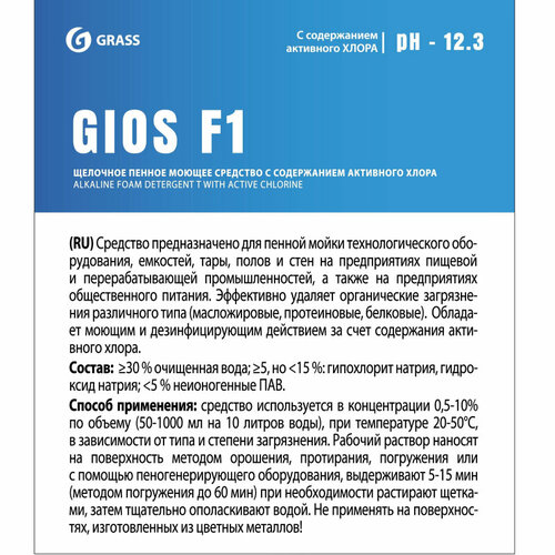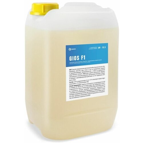Моющее средство для поверхностей и технологического оборудования Grass Gios F1 10 л (концентрат). Назначение: средство предназначено для пенной мойки технологического оборудования, емкостей, тары, полов и стен на предприятиях пищевой и перерабатывающей пр.