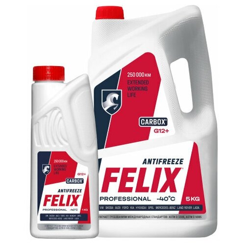 PROFESSIONAL ANTIFREEZE FELIX® CARBOX® G12+ - профессиональный карбоксилатный антифриз с увеличенным ресурсом эксплуатации (тип OAT). Соответствует требованиям стандарта G12+ по классификации Volkswagen.Отвечает требованиям спецификаций импортных автопроизводителей и международным стандартам: SAE J 1034, O-Norm V 5123, BS6580:2010, KSM2142, JIS K 2234.Единственный российский антифриз, успешно прошедший полный цикл испытаний в международной лаборатории ABIC TESTING LABORATORIES, INC по стандартам: ASTM D 3306, ASTM D 4985.Полностью совместим с оригинальными (OEM) антифризами, разработанными по передовой карбоксилатной технологии. Обладает увеличенным сроком эксплуатации – 250 000 км пробега или 5 лет использования (без смешивания с другими типами охлаждающих жидкостей).Охлаждающая жидкость Felix Carbox используется для первой конвейерной заливки на многих отечественных и зарубежных сборочных предприятиях.Цвет: красный. Готовый к применению.