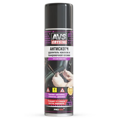 Высокоэффективное средство предназначено для быстрого и безопасного удаления наклеек, тонировочной пленки, самоклеящихся этикеток, липких лент, остатков скотча, жевательной резинки, каучука, дёгтя. Устраняет следы от перманентных маркеров и фломастеров. Применяется на любых поверхностях: стеклянных, металлических, пластиковых, керамических, в том числе на окрашенных. Гелеобразный состав после распыления не стекает с вертикальных поверхностей. Проникает под поверхность наклейки и растворяет клей. Обладает приятным ароматом. Не вызывает коррозию. Подходит для наружных и внутренних работ, а также для использования в быту. Обладает приятным цитрусовым ароматом.Способ применения: Для удаления наклеек: В случае нанесения на лакокрасочное покрытие или пластик заранее проверить действие состава на малозаметном участке поверхности. Перед использованием энергично встряхнуть баллон. Нанести средство с расстояния 10-15 см на наклейку, стикер или следы клея. Удерживая баллон в вертикальном положении, дать составу подействовать в течение 1-2 мин. и не дожидаясь высыхания, аккуратно удалить наклейку. Остатки клея протереть сухой салфеткой. При необходимости повторить обработку.Для удаления тонировочной пленки: Во избежание попадания следов аэрозоля необходимо защитить поверхности, не подлежащие обработке. Не допускать длительный контакт с пластиковыми деталями автомобиля. Равномерно прогреть стекло, подлежащее растонированию. Аккуратно поддеть край пленки и медленно, без рывков, снять пленку со всей площади стекла. Дать стеклу остыть и равномерно распылить состав на стекло, дать подействовать в течение 30-40 секунд. Удалить средство с помощью резинового скребка или сухой салфетки. Для окончательной очистки стекла рекомендуется использовать очистители стекол «AVS CRYSTAL».Меры предосторожности: огнеопасно! Содержимое под давлением! Предохранять от воздействия прямых солнечных лучей, воздействия статического электричества и нагревания свыше +50°С. Не распылять вблизи открытого огня и раскаленных предметов! Использовать только на открытом воздухе или в хорошо вентилируемом помещении. Не курить во время пользования! Не разбирать и не давать детям! Не вдыхать испарения, избегать попадания внутрь, на открытые участки кожи и в глаза. При попадании на кожу или в глаза, обильно промыть чистой водой. При необходимости обратиться за медицинской помощью. Использовать только по назначению. Использованный баллон не сжигать, утилизировать как бытовой отход.Тип: аэрозольОбъем: 335 млСостав:органический растворитель >30%, алифатические углеводороды >30%, нафтеновые углеводороды ≥5%, функциональные добавки <5%, ароматизатор <5%.