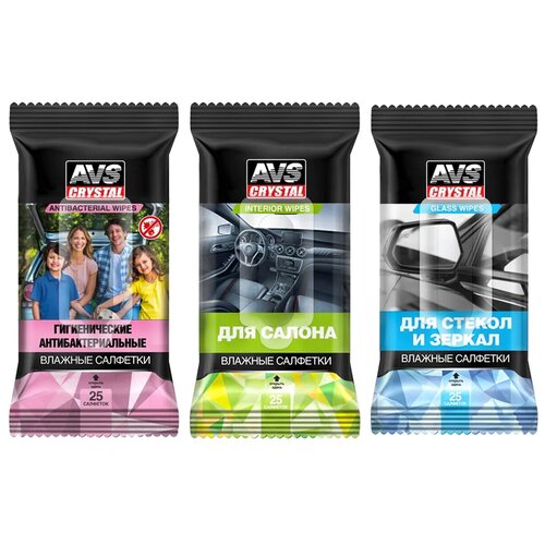 Комплект Влажные салфетки по 25шт AVS антибактериальные + для салона + для стекол, зеркал и фар (AVK-207, AVK-201, AVK-200) A78499S/A78102S/A78101S