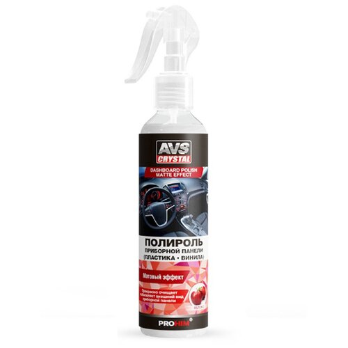 Очистка пластика салона автомобиля – это то, что нужно делать регулярно. Чтобы не собиралась пыль и грязь на панели. Незаменимым помощником станет для вас полироль пластика для приборной панели автомобиля матовый с ароматом яблока 250 мл AVS AVK-602!Полироль мягко и эффективно очистит пластиковые и виниловые детали и придаст потрясающий матовый эффект. Приборная панель, молдинги и другие элементы салона автомобиля приобретут матовый и обновленный внешний вид.Потрясающий матовый эффект полироли для пластика автомобиля подарит обработанным поверхностям безупречный внешний вид. Антистатический эффект (препятствие оседанию пыли) станет приятным дополнением к восстановительному действию полироли для автомобиля.После процедуры очищения в салоне вашего автомобиля, останется изумительный аромат яблока. Он окунет Вас в летнею атмосферу и подарит хорошее настроение и позитивные эмоции на весь день. Также он позволит Вам насладиться уникальной атмосферой в течение длительного времени.Преимущества:Проста в применении;Триггер;Аромат яблока;Легко помещается в руке;Универсален;Придает матовый эффект;Хорошо полирует;Подходит для всех видов транспорта.