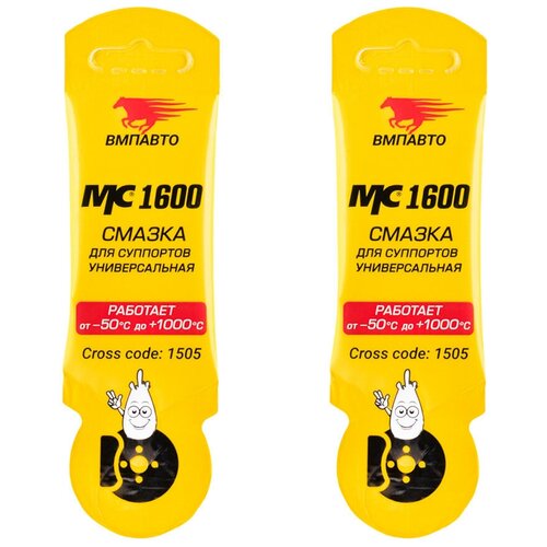 Каждый автовладелец часто сталкивается с различными скрипами в автомобиле. Очень часто скрип может привести к быстрому изнашиванию деталей, особенно тормозных колодок и суппортов, что становится небезопасным. Для того чтобы продлить жизнь деталям и обезопасить себя, Вам отлично подойдет Смазка МС-1600 для суппортов.Для обеспечения долговременной защиты суппортов следует использовать специальные смазочные материалы, например, универсальную смазку для суппортов МС-1600. Данный материал был разработан в научно-производственном центре вмп-авто. Это первая отечественная пластичная смазка для обслуживания направляющих суппортов. Она подходит для обслуживания резиновых компонентов, колодок и поршней.Смазка МС-1600 часто используется для устранения скрипа тормозов. Материал наносится тонким слоем на нерабочую поверхность тормозных колодок. Для рабочих поверхностей колодок и тормозных дисков данный материал применять нельзя.Смазка МС-1600 отлично подходит для направляющих. Она защищает их от коррозии, износа и обеспечивает подвижность элементов. Помимо этого, материал может использоваться на поршнях, что позволяет защитить узел от коррозии. Смазка также облегчает монтаж и демонтаж элементов тормозной системы.Преимущества:Широкий диапазон температур, от -50°С до +1000°С;Антикоррозийные свойства;Защита деталей тормозной системы от пригорания;Защита резиновых деталей суппорта от деформации;Устойчивость к вымыванию водой;Защита от воздействия соли и грязи;Не взаимодействует с тормозными жидкостями класса DOT 3, DOT 4, DOT 5.1;Комплект 2 штуки.