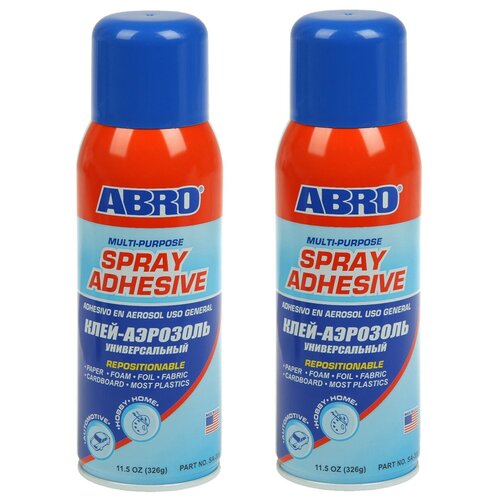 В салоне вашего автомобиля провисла ткань потолка? Возможно, в квартире ремонт и Вам нужно приклеить ковролин? С этими задачами прекрасно справится универсальный клей-аэрозоль ABRO!Универсальный высокопрочный клей быстрого действия для постоянного монтажа и фиксации. Он идеален для случаев, когда требуется быстрота высыхания. Аэрозольная упаковка обеспечивает равномерное и точное нанесение клея, в том числе и в труднодоступных местах.Данный клей надежно склеивает обивку салона, пластиковые покрытия, поролон, ткани, прорезиненные и другие материалы, используемые в автомобилях. Также может использоваться для склеивания картона, фольги, стекла, дерева, резины, пластиков, декоративного ламината, легких металлов, пластмассы, войлока, ткани, пенопласта, для домашних работ. После высыхания клей образует гибкое и прозрачное соединение, устойчивое к воздействию воды.Преимущества универсального клея-аэрозоля ABRO:Отсутствует необходимость приобретения дополнительного инструмента для нанесения средства;Не теряет прочности в широком диапазоне температур (-23°С - +93°С);Возможность покрывать клеем труднодоступные места без проблем;Легко очищается минеральным спиртом или бензином;Наличие большого количества сфер применения;Во время нанесения не оставляет подтеков;Стандарт американского качества;Удобен и прост в применении;Эффективен в использовании;Плотная консистенция;Экономичный расход;Высокая прочность;Устойчив к воде;Быстро сохнет;Комплект из 2 шт.Способ применения:1. Перед нанесением протестируйте на небольшом участке. Используйте баллон комнатной температуры. Работайте при температуре от 5 до 30°C. Поверхность должна быть чистой, сухой и обезжиренной.2. Перед использованием встряхивайте баллон в течение двух минут.3. Распыляйте клей с расстояния около 20-25 см. На пенополистирол наносите продукт с большего расстояния.4. Для долговечного склеивания: нанесите клей на обе поверхности, подождите 15-20 минут, после чего плотно прижмите материалы друг к другу.5. Для временного склеивания: нанесите тонкий равномерный слой клея на одну из поверхностей, которые вы хотите склеить, подождите 5-10 минут и прижмите материалы друг к другу.6. Если вы хотите склеить сильновпитывающие материалы, наносите на одну из поверхностей более толстый слой клея. Прижимайте материалы друг другу, пока клей еще влажный;7. После использования переверните баллон и нажмите на распылитель для его очистки.Может испортить внешний вид некоторых видов пластмассовых (стирол, полиуретан) и окрашенных поверхностей.