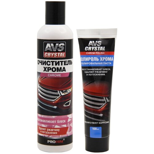 Хромированные детали придают внешнему виду автомобиля особый облик и улучшают его внешний вид. Хромирование защищает металлические элементы автомобиля от коррозии и делает уход за ними более легким. Со временем такое покрытие изнашивается, покрывается налетом или темнеет. С помощью очистителя хрома AVS Вы сможете обновить внешний вид хромированных и алюминиевых поверхностей.С очистителем AVS Вы сможете качественно очистить поверхность от пятен ржавчины и следов окисления. Очиститель рекомендуется использовать для обработки решеток, бамперов, хромированных дуг, деталей кузова, колесных дисков.Очиститель образует на обрабатываемой поверхности защитную пленку, которая препятствует быстрому загрязнению поверхности и придает зеркальный и глянцевый блеск.Рекомендуется применять очиститель для обработки хромированных дуг, решеток, колесных дисков, бамперов, и деталей кузова.С полировальной пастой AVS Вы сможете дополнить уход за хромированными и открытыми алюминиевыми поверхностями, а также колесными дисками и деталями кузова.Благодаря высококачественному эффективному составу с комбинацией микроабразивов и растворителей паста качественно справляется с удалением пятен ржавчины и следов окисления. Воски в составе пасты создают на обрабатываемой поверхности прозрачную глянцевую защитную пленку. Вы сможете тщательно очистить, восстановить и защитить хромированные и алюминиевые поверхности, а также колесные диски и детали кузова.При регулярном использовании пасты Вы гарантированно сохраните блеск и защиту обрабатываемых поверхностей.Преимущества: Комплект; Приятная стоимость; Качественный состав; Легкость применения; Высокая эффективность от применения комплекта; Высококачественный состав используемых средств; Очиститель содержит комбинацию микроабразивов и растворителей, которые удаляют пятна ржавчины и следы окисления; Комплексный уход за хромированными и алюминиевыми поверхностями; Регулярное использование пасты гарантирует сохранность блеска и защиту поверхности; Воски в составе полировальной пасты создают прозрачную защитную пленку на обрабатываемой поверхности.