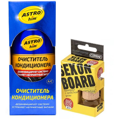 Многие автовладельцы сталкивались с неприятным запахом в автомобиле при включении кондиционера. Появление неприятного запаха может быть связано с накоплением пыли, грязи, а также может быть вызвано размножением бактерий, которые в свою очередь негативно влияют на здоровье человека. Очиститель ASTROHIM поможет Вам эффективно и без разборки очистить систему кондиционирования!Он дезинфицирует систему кондиционирования и уничтожает подавляющее большинство микроорганизмов, в том числе грибки и бактерии, предотвращает их размножение и уничтожая неприятные запахи. Восстанавливает свежий и чистый воздух и создает приятную атмосферу в салоне автомобиля, за счет содержания в составе натуральных эфирных масел можжевельника, пихты и мяты.В процессе обработки системы вентиляции активные компоненты очистителя попадают в самые удаленные уголки воздуховодов, кондиционера воздуха, уничтожая бактерии, скопившиеся в местах загрязнений. Действующее вещество остается так же в ячейках воздушного фильтра, на поверхностях в салоне автомобиля. При этом оно сохраняет свою активность и продолжает убивать бактерии и вирусы в воздушном потоке.С помощью ароматизатора дерево CONTEX SEX ON BOARD Вы дополните эффект от очистки системы вентиляции и сможете обновить аромат в салоне. Верхними нотками этого ароматизатора являются аромат грейпфрута который обладает терпким и волнующим очарованием и искрящимися цитрусовыми нотами. Композицию дополняют тонкие нотки лепестков роз, которые, подобны легкому дуновению ветерка доносящему ароматы садов Франции. Они обладают неповторимым тонким нежно-фруктовым ароматом.Из-за подвесного формата Вы сможете сами выбрать, где расположить данный ароматизатор. Этот ароматизатор безопасен при использовании на постоянной основе.Преимущества комплекта: Доступная цена; Ароматизатор создаст приятную атмосферу в салоне автомобиля; Комплект из очистителя кондиционера и ароматизатора вернет Вашему салону свежесть; С помощью ароматизатора Вы наполните салон ароматом грейпфрута с лепестками розы;С помощью очистителя Вы эффективно и быстро устраните неприятные запахи, бактерии, грибковую плесень и причину их появления в будущем; Действующее вещество остается на ячейках воздушного фильтра. При этом оно сохраняет свою активность, продолжая убивать бактерии и вирусы в воздушном потоке; Легкость в применении: очиститель используется без демонтажа салонного фильтра и разборки системы кондиционирования, а сама процедура очистки не займет много времени.