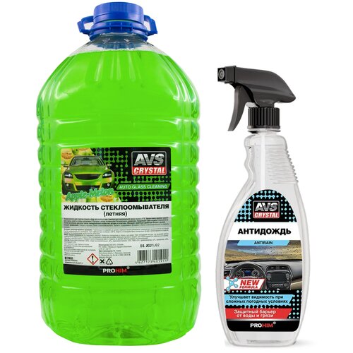 Жидкость стеклоомывателя летняя 5л AVS AVK-723 омывайка для машины + Антидождь для автомобиля New Formula 500мл AVS AVK-075 A40591S/A78384S