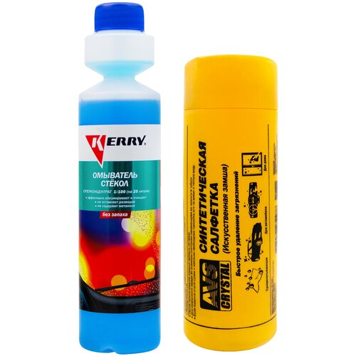 Загрязнения лобового стекла автомобиля считаются злободневной проблемой каждого автовладельца, а с наступлением теплого времени года ко всему добавляются еще следы от насекомых, затрудняющие обзор дороги. Если Вы дорожите комфортом при вождении и хотите, чтобы лобовое стекло Вашего авто было кристально чистым, то Вам на помощь придет летний омыватель стекол концентрат KERRY и искусственная замша AVS!Содержащиеся в составе концентрата поверхностно-активные добавки, обладающие высокой моющей способностью с легкостью справляются с удалением дорожной грязи, масляных пятен, следов насекомых, птичьего помета, смолы растений.Использование жидкости стеклоомыватель KERRY обеспечивает идеальную чистоту фар, лобового и заднего стекол автомобиля. Омыватель улучшает обзор во время движения и не оставляет разводов и радужной пленки. Он безвреден для лакокрасочных покрытий, резиновых и пластиковых деталей. Благодаря составу замши из многослойного армированного поливинилацетатного полотна с добавлением хлопка она не поцарапает вам поверхность автомобиля и при этом моментально впитывает воду. А также самое главное то, что она легка в использовании.. Преимущества:: Улучшает обзор;; Бутылка с дозатором;; Не содержит метанола;; Не оставляет разводов;; Не оставляет радужной пленки;;1 флакон рассчитан на 25 л. воды;; Суперконцентрированный состав;; Повышает безопасность движения;; Эффективно обезжиривает и очищает;; Предохраняет стекла и щетки от абразивного износа;; Безопасен для лакокрасочных покрытий, резиновых и пластиковых деталей;; Обеспечивает идеальную чистоту фар, лобового и заднего стекол автомобиля.. Устойчива к воздействию масла, топлива и очищающих жидкостей;; Подходит для мытья автомобиля и для домашнего использования;; Обеспечит чистую, сухую и блестящую поверхность без разводов и ворсинок.