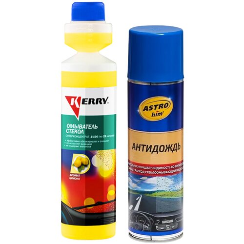 Жидкость стеклоомывателя летняя 270 мл KERRY / омывающая жидкость с ароматом лимона (омывайка летняя), суперконцентрат + Антидождь для стекол и зеркал автомобиля (защитный спрей для лобового стекла с эффектом антидождя) ASTROHIM - 355 мл. KR-338/АС-893