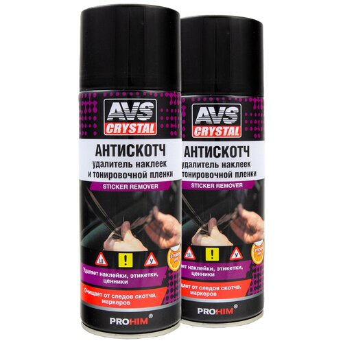 Все сталкивались с ситуацией, когда после удаления какой-либо этикетки, наклейки или скотча на поверхности остается клеевой состав, который убрать достаточно проблематично.Для решения данной проблемы компания AVS выпустила удалитель наклеек и тонировочной пленки "Антискотч" AVK-692. Это средство поможет Вам с легкостью избавиться от всех ненавистных следов и при этом не повредить поверхность.Комплект антискотчей станет незаменимым помощником для быстрого и безопасного удаления: наклеек, тонировочной пленки, самоклеящихся этикеток, липких лент, остатков скотча, жевательной резинки, каучука, следов маркеров, дёгтя.Преимущества AVK-692:Комплект из 2 шт.Устраняет следы от перманентных маркеров и фломастеров.Гелеобразный состав после распыления не стекает с вертикальных поверхностей.Проникает под поверхность наклейки и растворяет клей.Не вызывает коррозию.Подходит для наружных и внутренних работ,Может использоваться в быту.Способ применения:Для удаления наклеек:1. В случае нанесения на лакокрасочное покрытие или пластик заранее проверить действие состава на малозаметном участке поверхности.2. Перед использованием энергично встряхнуть баллон.3. Нанести средство с расстояния 10-15 см на наклейку, стикер или следы клея.4. Удерживая баллон в вертикальном положении, дать составу подействовать в течение 1-2 мин. и не дожидаясь высыхания, аккуратно удалить наклейку.5. Остатки клея протереть сухой салфеткой.6. При необходимости повторить обработку.Для удаления тонировочной пленки:1. Во избежание попадания следов аэрозоля необходимо защитить поверхности, не подлежащие обработке.2. Не допускать длительный контакт с пластиковыми деталями автомобиля.3. Равномерно прогреть стекло, подлежащее растонированию.4. Аккуратно поддеть край пленки и медленно, без рывков, снять пленку со всей площади стекла.5. Дать стеклу остыть и равномерно распылить состав на стекло, дать подействовать в течение 30-40 секунд.6. Удалить средство с помощью резинового скребка или сухой салфетки.Для окончательной очистки стекла рекомендуется использовать очистители стекол «AVS CRYSTAL».