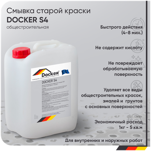 Смывка старой краски Docker S4 предназначена для быстрого(4-8 мин.) и эффективного удаления лакокрасочных покрытийс металлических и деревянных поверхностей. Глубокопроникает в покрытие, активно размягчая его. Готовый кприменению продукт. Эффективно удаляет лакокрасочныематериалы на масляной, алкидной, фенолформальдегидной,и акриловой основах с поверхности металла и дерева.Благодаря тиксотропности (гель) легко наносится навертикальные поверхности, не стекая с них.