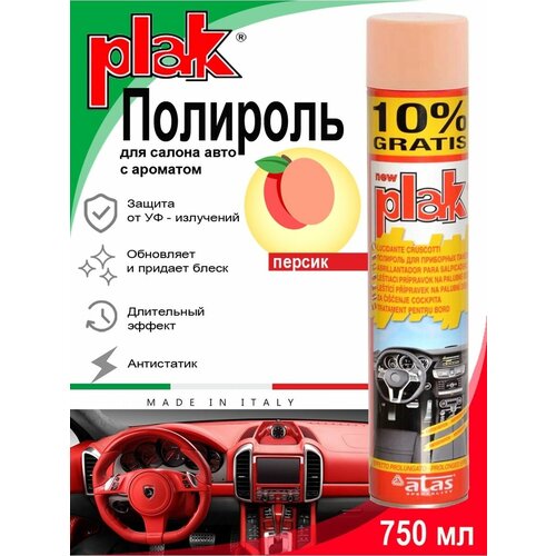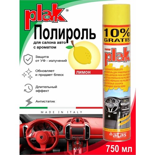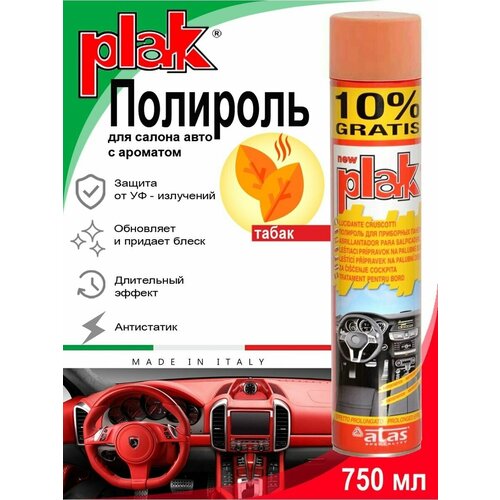 PLAK Полироль для салона авто (750 мл) - продукт проверенного качества, представлен на рынке уже около 30 лет и считается основным средством по уходу за салоном автомобиля. Полироль для пластика автомобиля на основе особых силиконов придает блеск и защищает от пыли приборную панель и детали салона из пластика, дерева и кожимита. Антистатик для автомобиля обладает антистатическим действием, отталкивает пыль. Полироль для автомобиля замедляет изнашивание деталей, очень экономичен, эффект сохраняется на длительное время, легко наносится. Кроме того, рекомендуется использовать полироль автомобиля как полироль для мебели, а также мраморных и резиновых поверхностей. Полироль для машины также может применяться и в быту для полировки мебели. Полироль Plak предназначен для ухода за приборной панелью и пластиковыми деталями салона, содержит освежитель воздуха продленного действия. Автохимия возвращает первоначальный блеск всем пластмассовым, виниловым и резиновым элементам отделки салона автомобиля, создавая на поверхности стойкий антистатический слой, отталкивающий пыль и грязь. Также полироль для автомобиля для пластика позволяет создать глянцевое покрытие. Способ применения: тщательно взболтайте содержимое баллона; распыляйте аэрозоль на поверхность с расстояния в 20-25 сантиметров; отполируйте поверхность мягкой не ворсистой тряпкой.