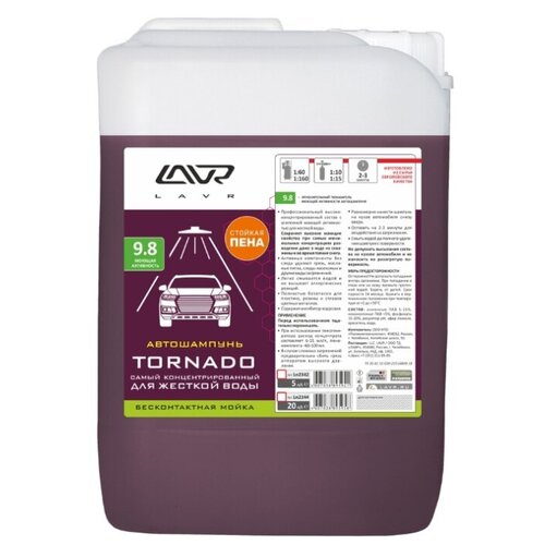 Автошампунь TORNADO от LAVR работает в любой воде без следа удаляет грязь, масляные пятна, следы насекомых и другие виды загрязнений легко смывается водой обладает нейтральным запахом безопасен для аллергиков бережно относится к пластику, резине и сплавам цветных металлов. защищает лакокрасочное покрытие от коррозии. Концентрированный автошампунь для бесконтактной мойки TORNADO идеален для использования в воде из скважины и в межсезонье. Он замечательно справляется с умеренными и сильными загрязнениями. Состав: Анионные ПАВ 5-15%, неионогенные ПАВ 5-15%, хелатирующие добавки 15%, регулятор рН 15%, эфир гликоля 5%, краситель 1%, вода.