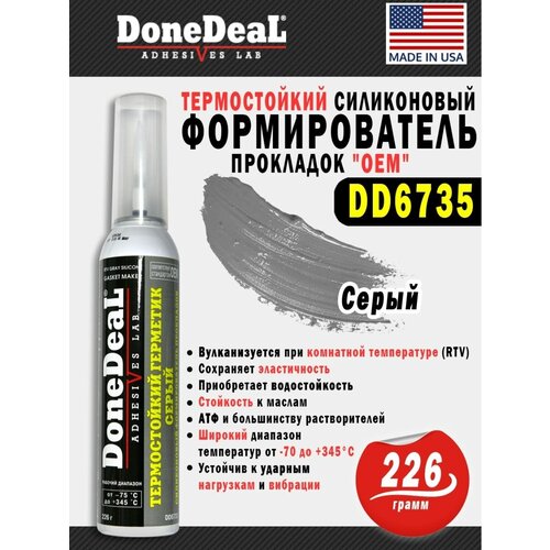 Термостойкий серый силиконовый формирователь прокладок "ОЕМ" DD6735 226 г в аэрозольной упаковке. Герметик серый разработан и рекомендован для гарантийного ремонта европейских и американских автомобилей, ремонта и модернизации транспортных и водно-моторных средств, установки поддона картера двигателя и трансмиссии, клапанной крышки, впускного коллектора, водяной помпы, корпуса термостата, крышек двигателя; замены и улучшения заводских силиконовых и штатных твердых прокладок на отечественных и иностранных автомобилях, оборудовании и механизмах. Термостойкий герметик вулканизуется при комнатной температуре (RTV), сохраняет эластичность, приобретает водостойкость, стойкость к маслам, АТФ и большинству растворителей (не рекомендуется длительный контакт с бензином), имеет широкий рабочий диапазон температур от -70 до +345 °С, устойчив к ударным нагрузкам и вибрации. Соответствует или превосходит официальные стандарты производителей автомобилей США О. Е. М, Европы и Азии IS09000. Применение: Удалите старую прокладку (рекомендуется аэрозоль Быстрая смывка HG5782), очистите и просушите обрабатываемые поверхности. Обрежьте патрубок баллона до необходимого размера, обеспечивающего нужную толщину слоя герметика. Держите патрубок баллона под углом 45° и используйте в любом направлении. Нанесите непрерывный, однородный (3 мм) слой герметика по периметру одной из соединяемых поверхностей. Полностью обведите все выступающие элементы и отверстия резьбовых соединений. Выдержите 10 минут до схватывания, соедините и зафиксируйте обрабатываемые поверхности. В процессе схватывания выделяется уксусная кислота, появляется запах уксуса. Отремонтированная техника может эксплуатироваться через 6 часов (80 % максимальной прочности). Удалите острым инструментом избыток герметика с обрабатываемой поверхности. После окончания работы выпустите из патрубка каплю материала, которая образует уплотняющую пробку. Для повторного использования состава удалите уплотняющую пробку герметика из патрубка. Примечание: После вулканизации (6 часов) безопасен для кислородных датчиков. Полидиметилсилоксан, силаны, диоксид титана, 1,1-дифторэтан, функциональные добавки, составляющие ноу-хау компании. Внимание: Огнеопасно! Баллон находится под давлением. Не прокалывайте и не сжигайте! Храните при температуре не выше +49 °С. Избегайте вдыхания паров продукта. При попадании: в глаза: промойте большим количеством холодной воды в течение 15 минут, посоветуйтесь с врачом; на кожу: удалите продукт бумажным полотенцем, вымойте загрязненный участок кожи водой с мылом; в желудочно-кишечный тракт: выпейте воды или молока, не вызывайте рвоту и обратитесь к врачу. После использования или окончания срока годности утилизируется как бытовые отходы. Хранить в недоступном для детей месте!