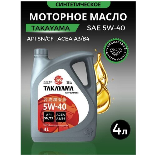 Это TAKAYAMA SAE 5W-40 API SN/СF современное синтетическое энергоэффективное моторное масло для тяжелонагруженных бензиновых и дизельных двигателей. Данное моторное масло 5w-40 удовлетворяет последним требованиям по выбросам в окружающую среду. Высококачественные базовые масла и многофункциональный пакет присадок обеспечивает быстрый и легкий запуск двигателя при низких температурах . Также масло моторное синтетическое рекомендовано в качестве всесезонного для двигателей новых и с большим пробегом. Масло моторное 5w40 синтетическое рекомендовано для бензиновых и дизельных двигателей легковых автомобилей и легких грузовиков, в том числе с турбонаддувом и системами нейтрализации отработавших газов, где рекомендуются масла и жидкости класса вязкости SAE 5W-40 спецификаций ACEA A3/B4, API SN/СF. Моторное масло 5w-40 4 литра предотвращает образование осадка внутри двигателя. Также данное масло автомобильное снижает трение и износ деталей мотора. Обращаем Ваше внимание, что в нашем магазине Вы также можете приобрести оригинальные автомасла других известных брендов: sintec, rolf, takayama, gazpromneft.